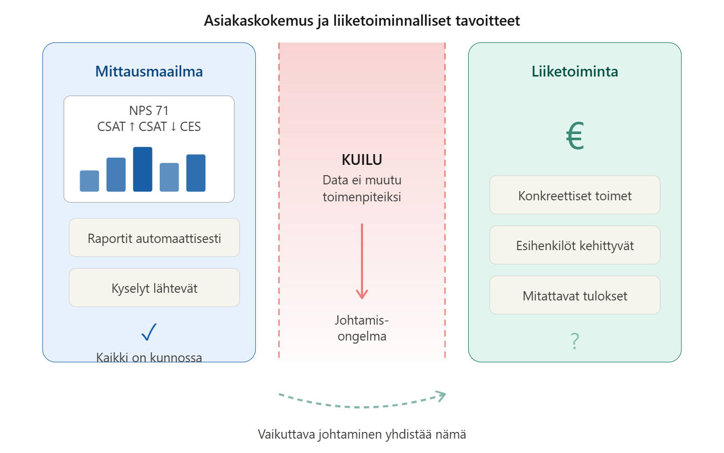 Kun mittausdata jää BI-tiimin raportteihin, eikä ohjaa arjen päätöksiä, asiakaskokemuksen kehittäminen irtoaa liiketoiminnan realiteeteista. Syntyy näennäinen aktiivisuus: kehitysprojekteja, workshopeja, toimenpidelistoja, mutta vaikuttavuus jää ohueksi. Mittaustulokset kertovat, mitä on tapahtunut, mutta se ei kerro, mitä yrityksen tai organisaation pitäisi tehdä. Tässä on mielestäni asiakaskokemusmarkkinassa iso virhe, luullaan, että tieto mittaustuloksesta riittää.